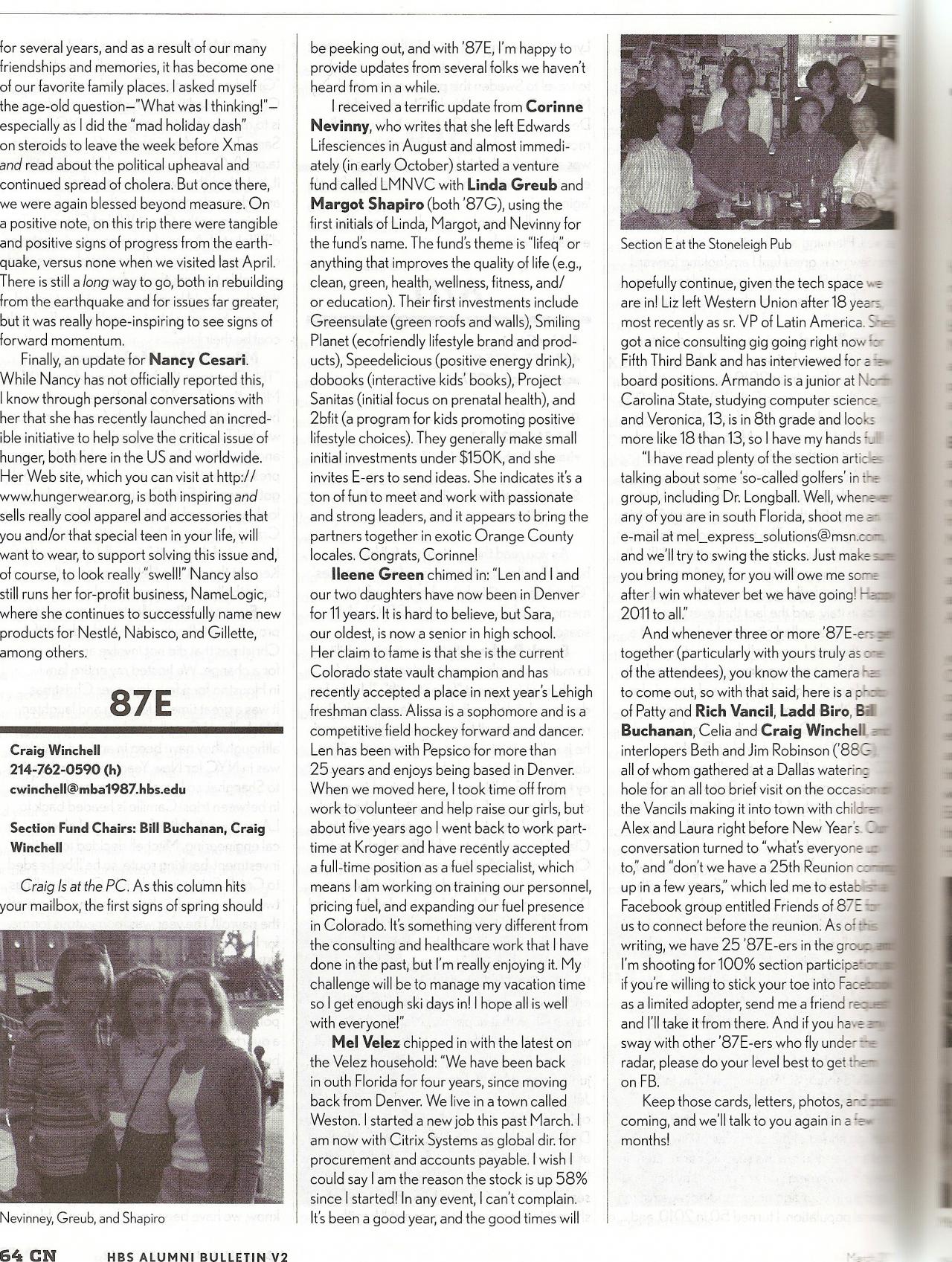 During 2010, HBS ’87 classmates Corinne Nevinny, Margot Sherr Shapiro and Linda Greub founded LMN Ventures to provide seed financing and business support to entrepreneurs who are focused on LifeQ - clean, green, health, wellness, fitness and education-oriented businesses businesses that improve the quality of life. During the past several years, Corinne, Margot and Linda have come to realize that women entrepreneurs face some unique dynamics, advantages and challenges, not the least of which is that, according to Dow Jones VentureSource, less than 5% of venture capital funding goes to female CEOs.